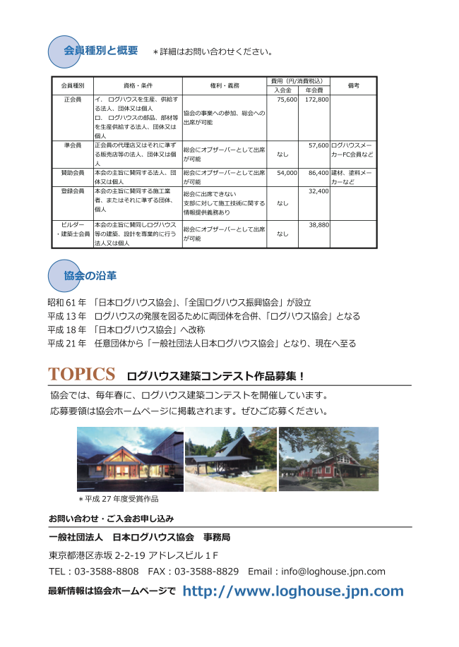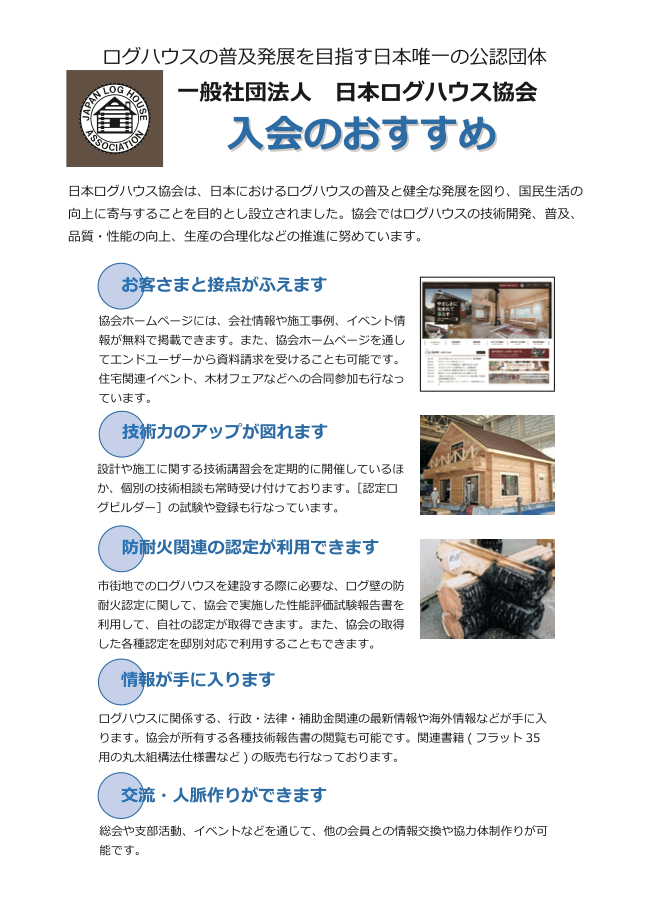 ログハウスに関係する、行政・法律・補助金関連の最新情報や海外情報などが手に入ります。協会が所有する各種技術報告書の閲覧も可能です。関連書籍(フラット35用の丸太組構法仕様書など)の販売も行っております。