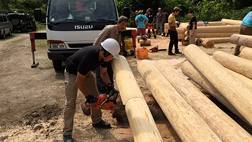1日目は木材に関する知識、建築施工管理、法令等の学科講習、2日目はチェーンソーによるログ部材の加工と組立が行われました。
