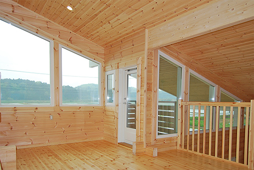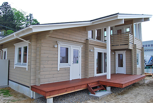 七尾市でランタサルミログハウスが完成! 北陸発の片流れの屋根形状がダイナミックな外観デザイン。傾斜天井をいかした吹抜けや、窓は全てトリプルサッシ。 暮らしにゆとりをもたらすロフトのフリースペースなど、暮らしの夢を随所に盛り込んだプランです。