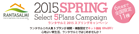 都市型総2階プランや平屋、開放感が魅力の大屋根プランなど、ランタサルミログハウスの人気5モデルプランのキット本体価格が10%OFFとなる「ランタサルミ2015スプリングキャンペーン」を開催!