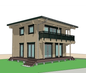 低勾配屋根の間口6.5m×6.85mの四角いログハウス。