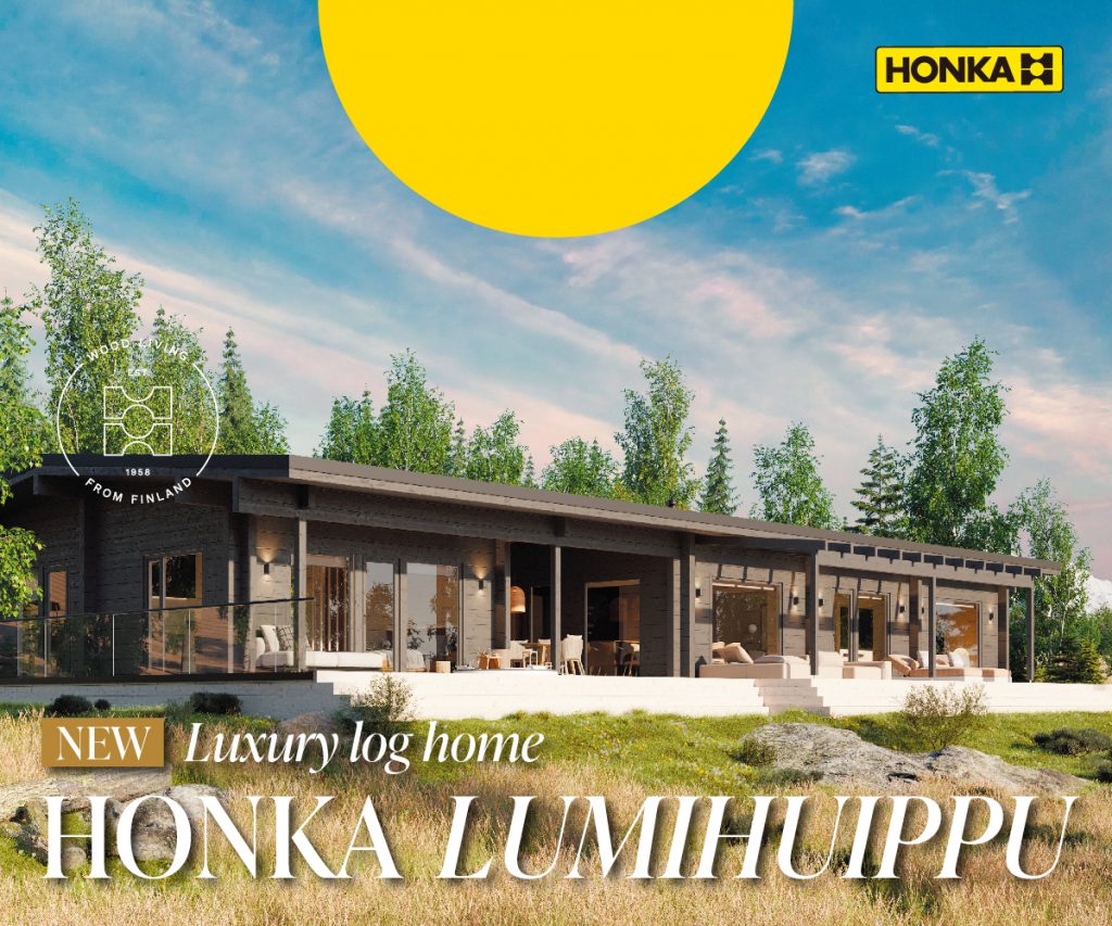ホンカのラグジュアリーホーム「ルミフイップ」。ゆったりしたエントランスホールでつながれたレジデンスとスパ・エリアのある高級ホテルで過ごすように暮らすホンカの新モデルです。
