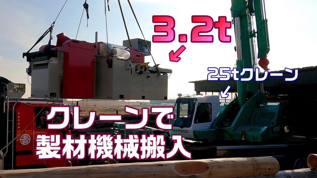 クレーン屋さんも来てもらって搬入しました。本体だけで3.2tも有る機械を皆で搬入、据え付けしました。これで、一般ではなかなか流通しない大径木・長尺物の材料を作ることが出来ます‼ 勿論、ご入用の方には当社で製材して販売いたしますので、お気軽にお声がけしてくださいね‼