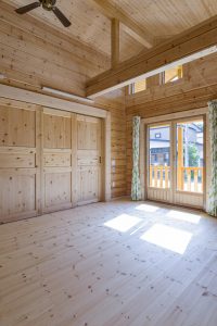 親子3人で暮らす、2LDK+デッキ&バルコニー付きのログハウスです