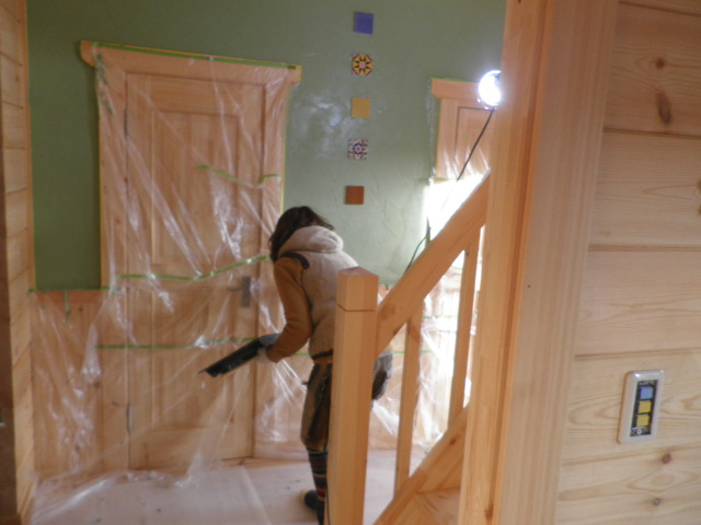 ↓ログハウスの室内間仕切壁に塗られたK様。