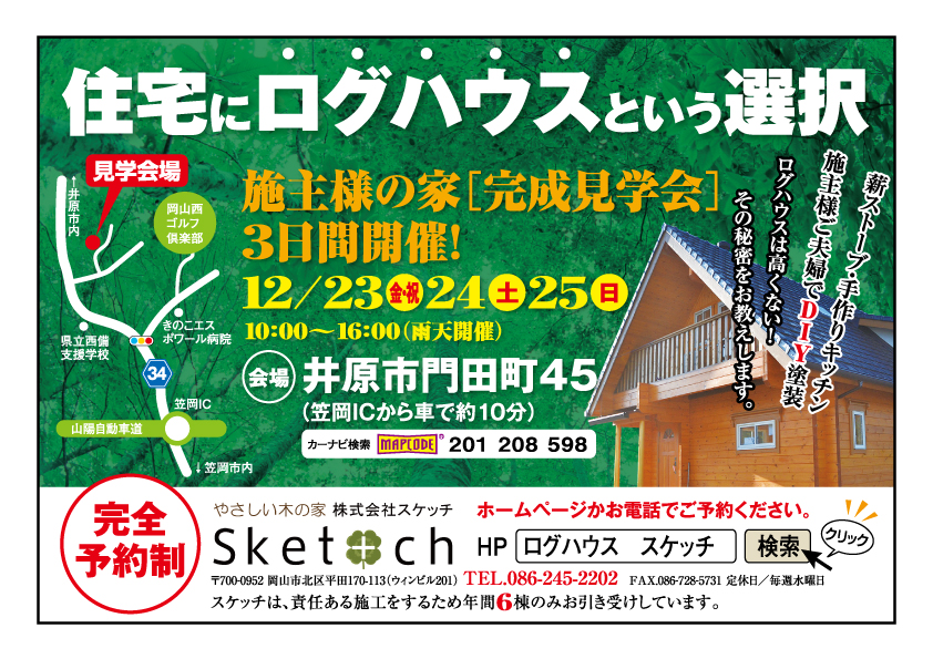 【やさしい木の家㈱Sketch】今年最後の完成見学会(岡山県井原市12/23~25)