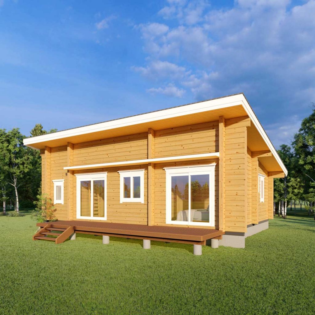 片流れ屋根のコンパクトな平屋ログハウスが完成します。
