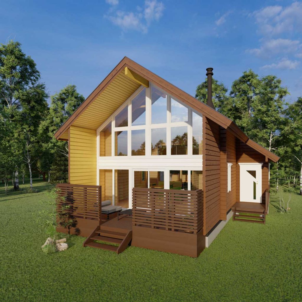 開放的な大開口の総2階建てログハウスが完成します!延床面積約50坪の2LDK+フリースペース付きで、外壁に囲まれた落ち着きのあるウッドデッキがポイントです。