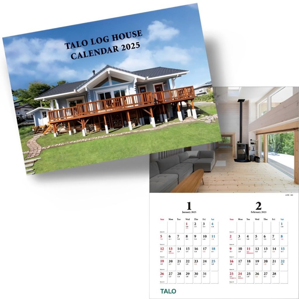 TALOログハウスの実例写真が多数掲載された2025年オリジナルカレンダーが完成しました!カタログをご請求頂いた方にもれなくプレゼントいたします。