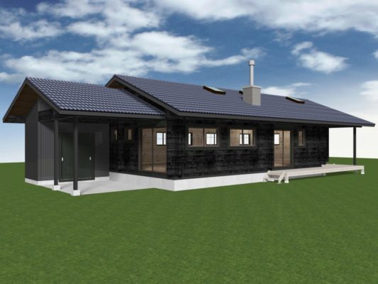 ログ部分の住居につなげた収納用の倉庫がアクセントになり、横長のどっしり安定感がある平屋。